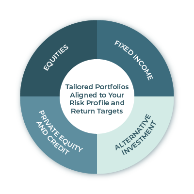 We build globally diversified portfolios across Equities, Fixed Income, Private Equity & Credit, and Alternative Investments. Each mandate is tailored to a client’s risk appetite and target returns—balancing capital growth, income, and downside risk through disciplined research and active risk management.