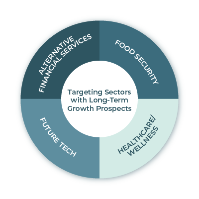 Our Private Access Mandate targets sectors with long-term growth prospects across four themes: Alternative Financial Services, Food Security, Healthcare and Wellness, and Future Tech. Focus areas are pawnbroking, moneylending and fintech; listed, midstream and downstream food businesses; specialist healthcare and wellness centres including aged care; and AI, data centres and business enabler systems such as ESG and E-invoicing.
